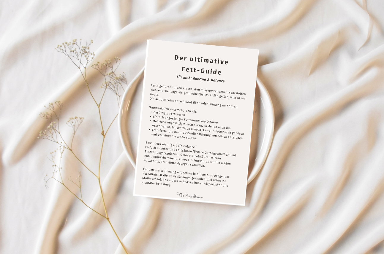 Hol dir jetzt meinen kostenlosen Guide und ich zeige dir, welche Fette deine Energie, Hormonbalance und Zellgesundheit wirklich unterstützen – und welche du besser meidest. Kompakt, wissenschaftlich fundiert und alltagstauglich.